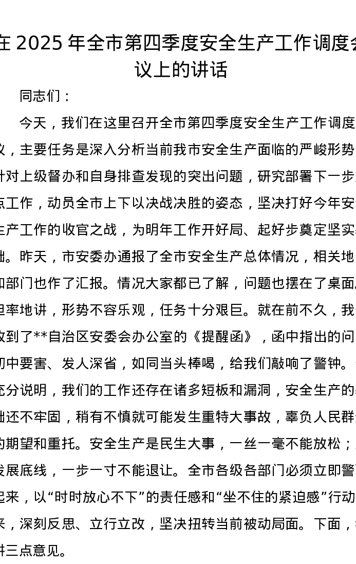 在2025年全市第四季度安全生产工作调度会议上的讲话