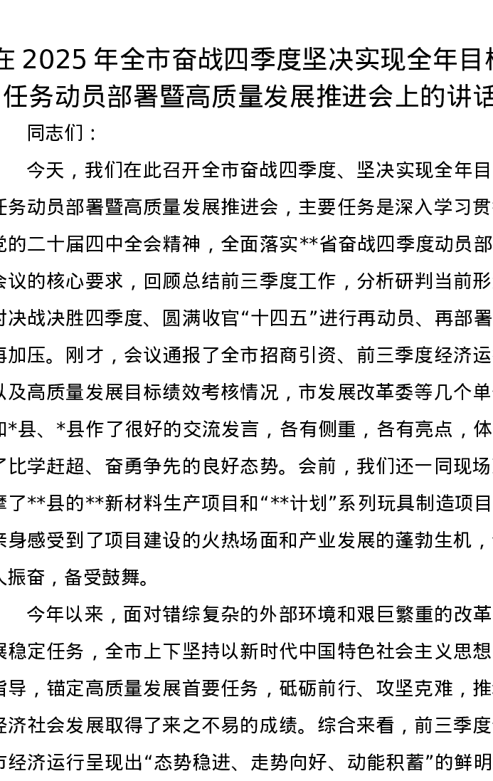 在2025年全市奋战四季度坚决实现全年目标任务动员部署暨高质量发展推进会上的讲话