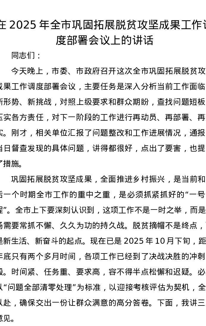 在2025年全市巩固拓展脱贫攻坚成果工作调度部署会议上的讲话
