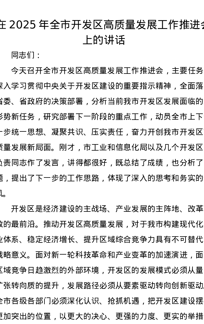 在2025年全市开发区高质量发展工作推进会上的讲话