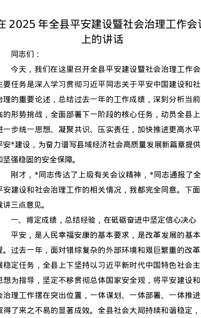 在2025年全县平安建设暨社会治理工作会议上的讲话
