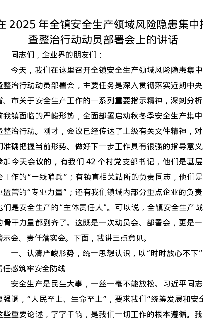 在2025年全镇安全生产领域风险隐患集中排查整治行动动员部署会上的讲话