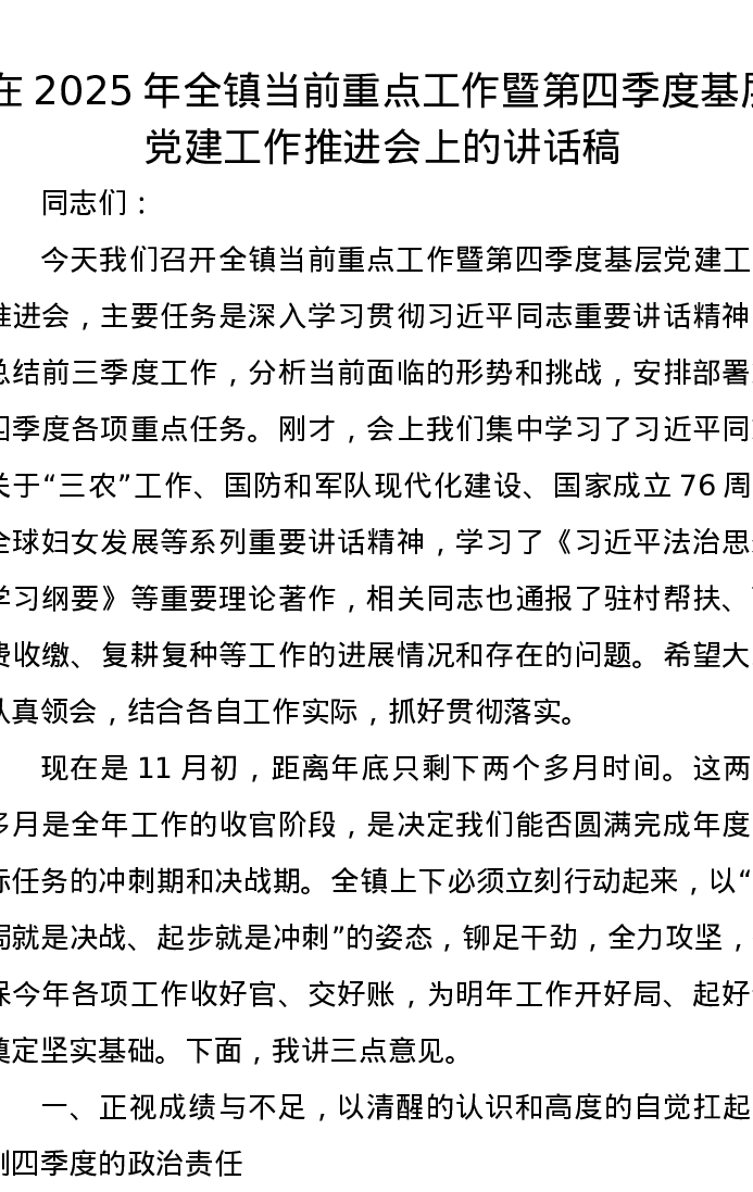 在2025年全镇当前重点工作暨第四季度基层党建工作推进会上的讲话稿