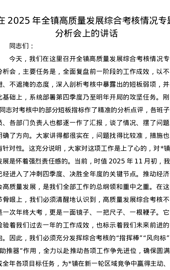 在2025年全镇高质量发展综合考核情况专题分析会上的讲话
