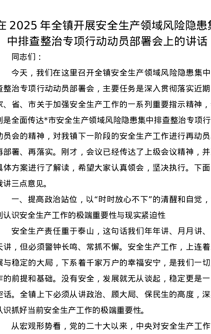 在2025年全镇开展安全生产领域风险隐患集中排查整治专项行动动员部署会上的讲话