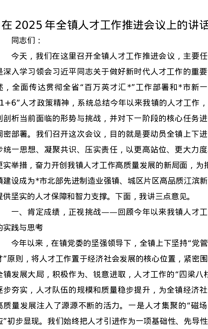 在2025年全镇人才工作推进会议上的讲话