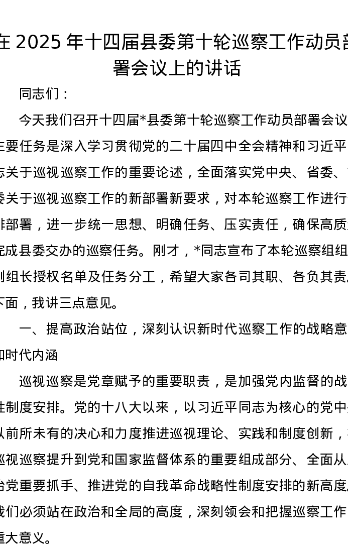 在2025年十四届县委第十轮巡察工作动员部署会议上的讲话