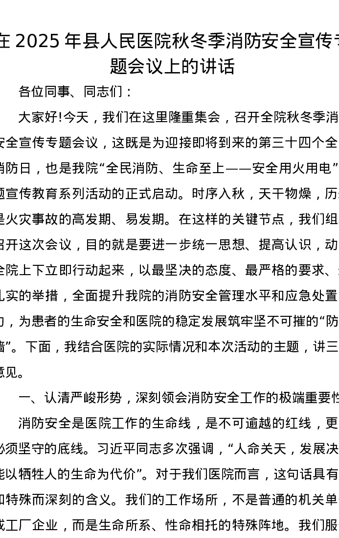 在2025年县人民医院秋冬季消防安全宣传专题会议上的讲话
