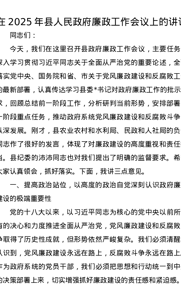 在2025年县人民政府廉政工作会议上的讲话