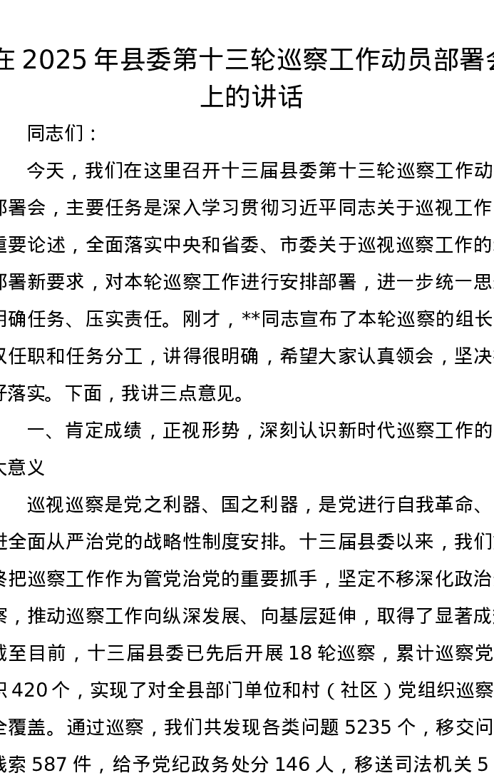 在2025年县委第十三轮巡察工作动员部署会上的讲话