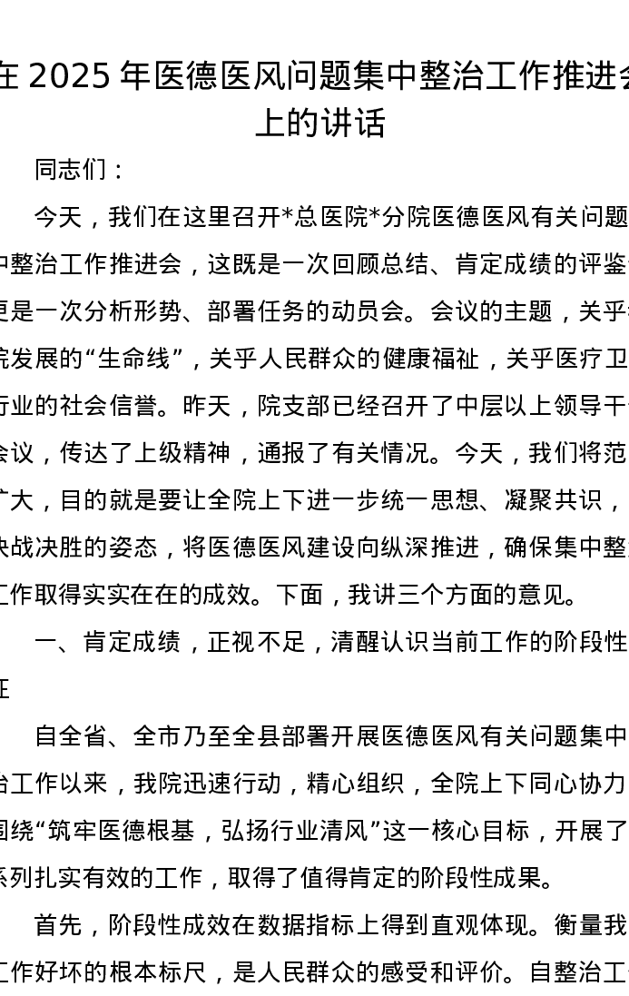 在2025年医德医风问题集中整治工作推进会上的讲话