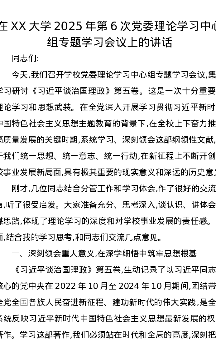 在XX大学2025年第6次党委理论学习中心组专题学习会议上的讲话(《习近平谈治国理政》第五卷)