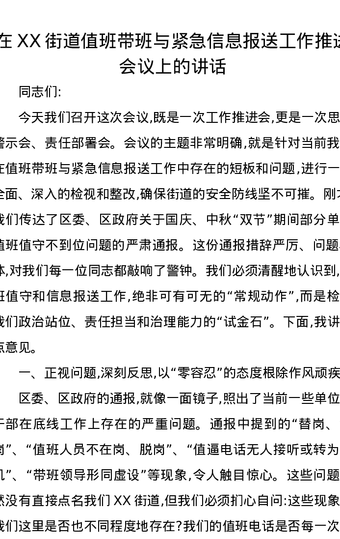 在XX街道值班带班与紧急信息报送工作推进会议上的讲话