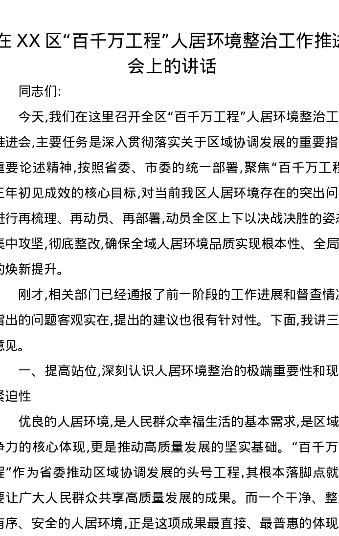 在XX区“百千万工程”人居环境整治工作推进会上的讲话