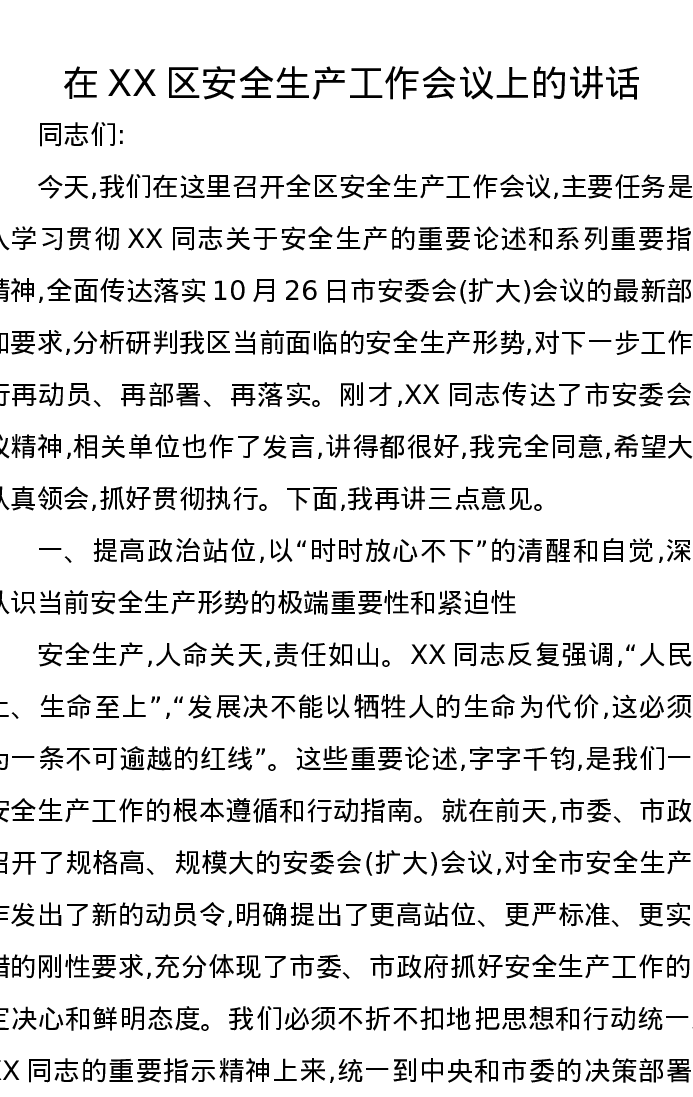 在XX区安全生产工作会议上的讲话