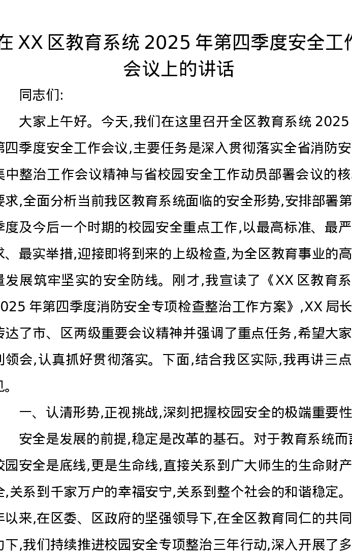 在XX区教育系统2025年第四季度安全工作会议上的讲话