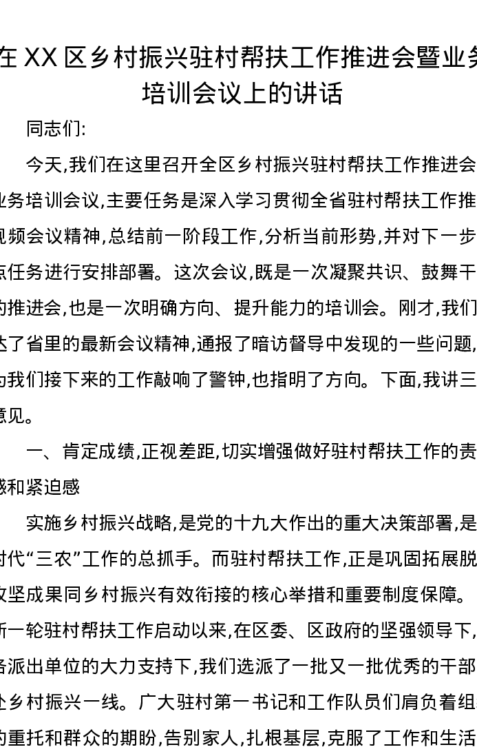 在XX区乡村振兴驻村帮扶工作推进会暨业务培训会议上的讲话