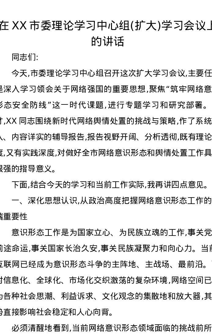 在XX市委理论学习中心组(扩大)学习会议上的讲话