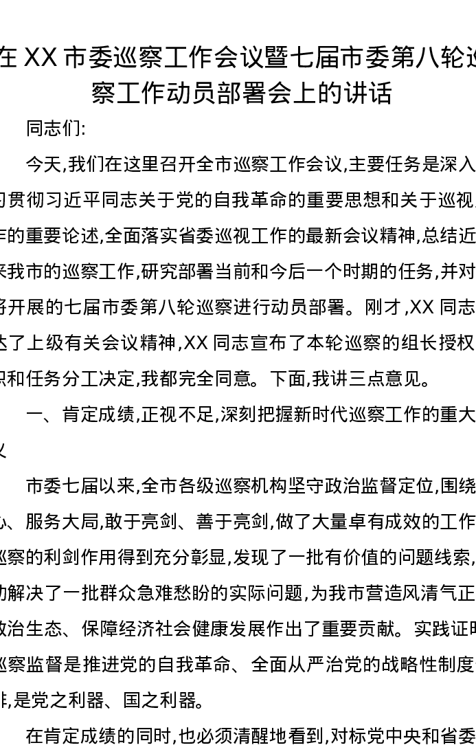 在XX市委巡察工作会议暨七届市委第八轮巡察工作动员部署会上的讲话
