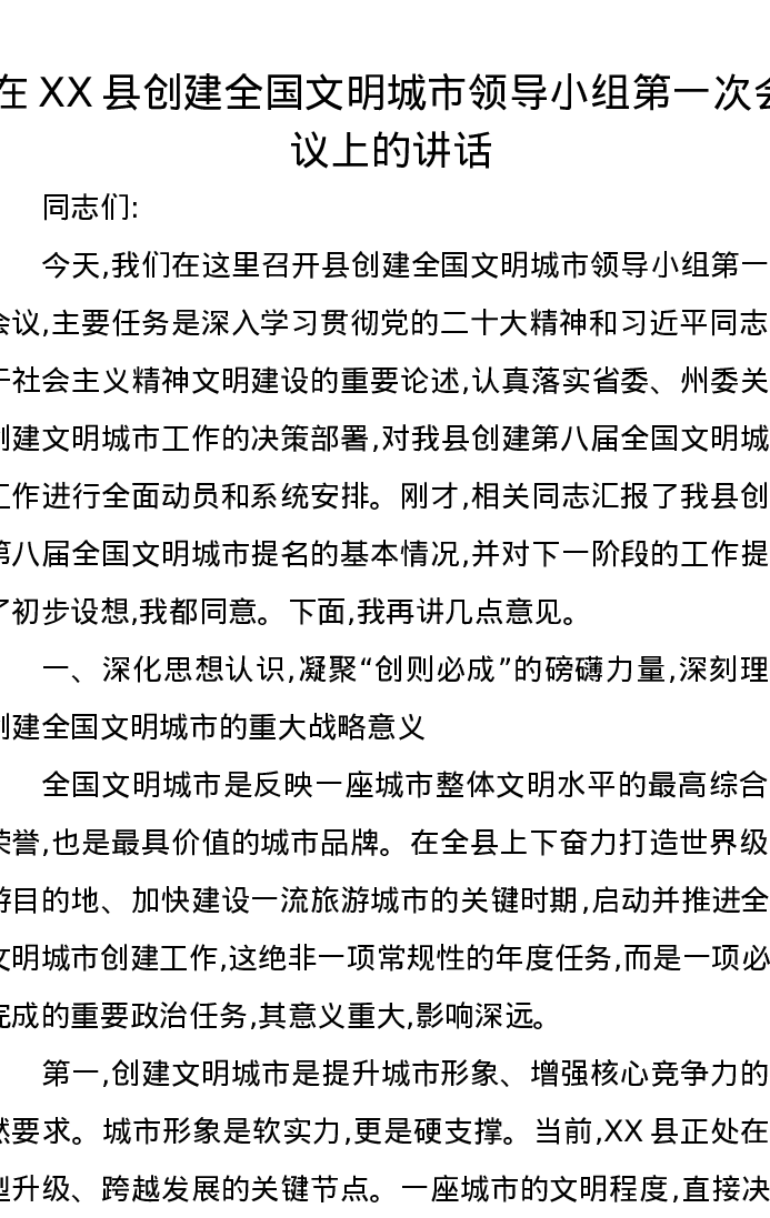 在XX县创建全国文明城市领导小组第一次会议上的讲话