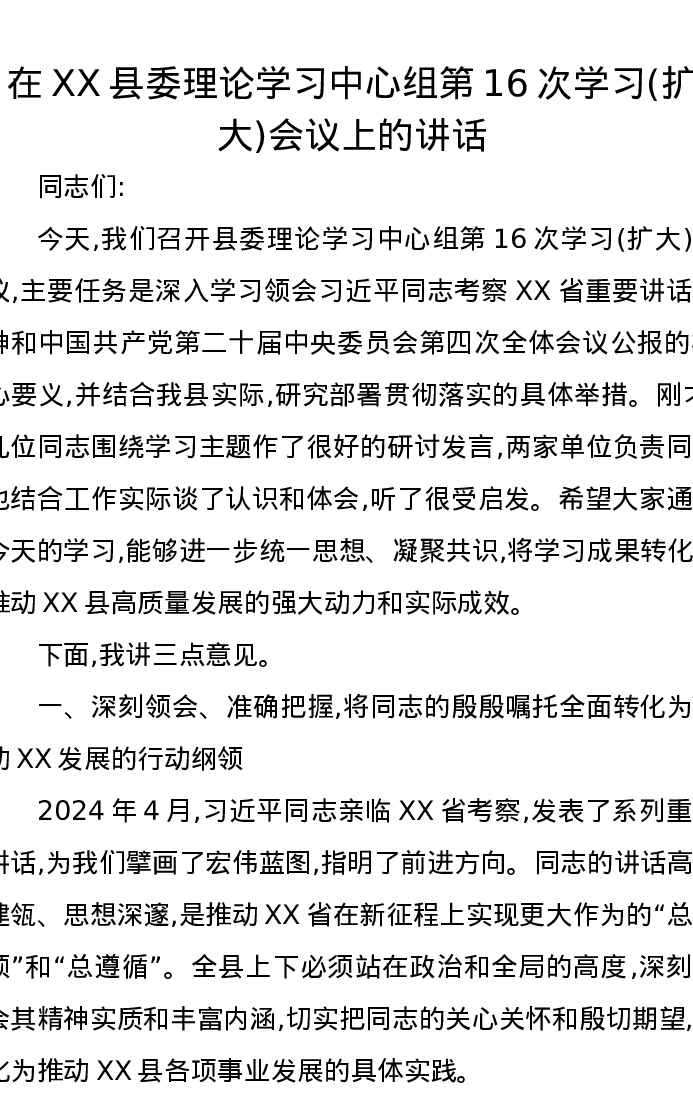 在XX县委理论学习中心组第16次学习(扩大)会议上的讲话