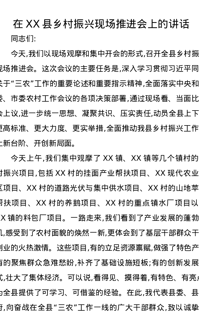 在XX县乡村振兴现场推进会上的讲话