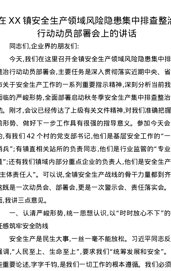 在XX镇安全生产领域风险隐患集中排查整治行动动员部署会上的讲话