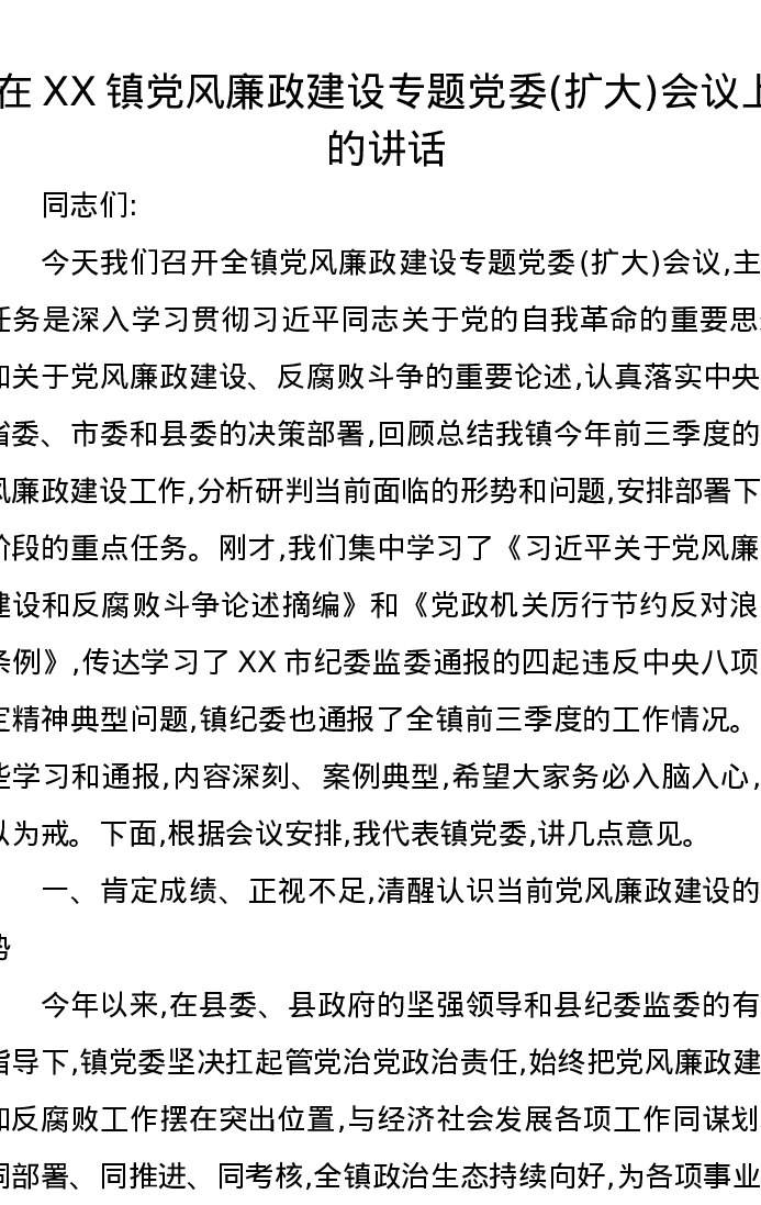 在XX镇党风廉政建设专题党委(扩大)会议上的讲话
