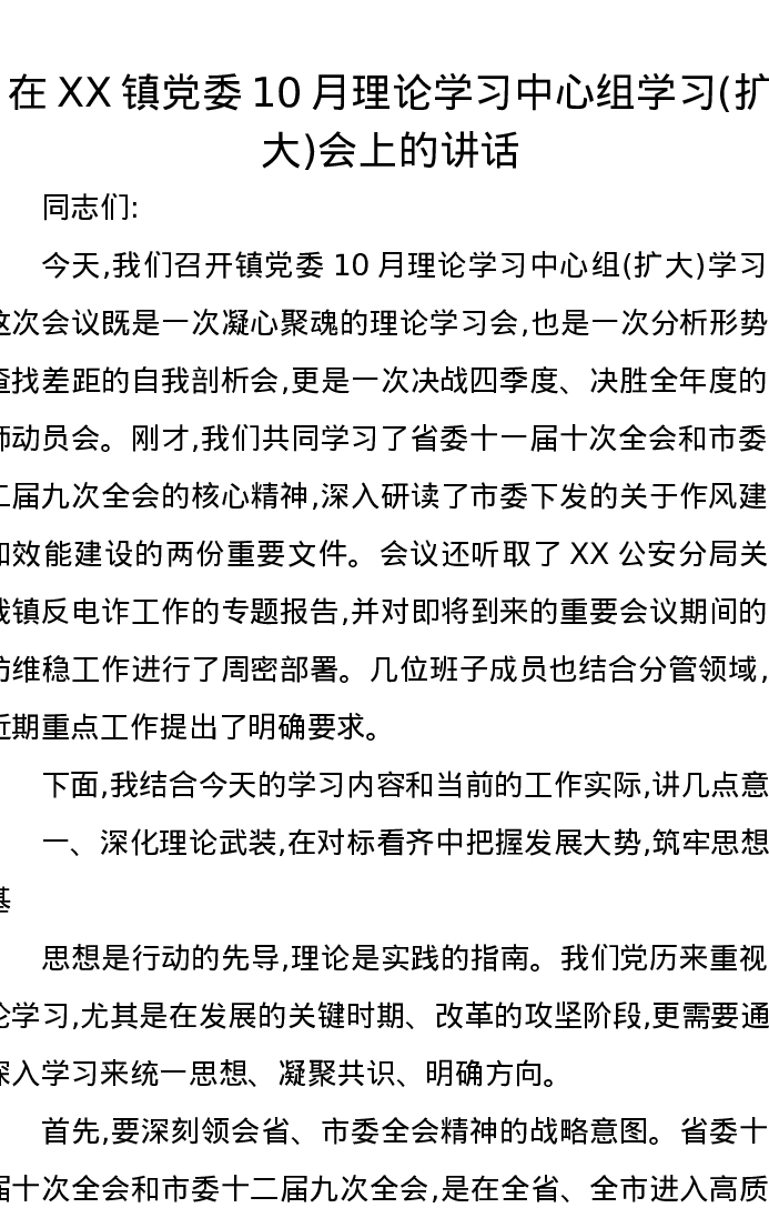 在XX镇党委10月理论学习中心组学习(扩大)会上的讲话