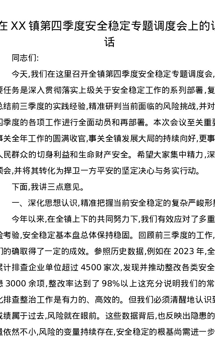 在XX镇第四季度安全稳定专题调度会上的讲话