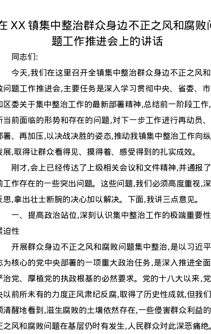 在XX镇集中整治群众身边不正之风和腐败问题工作推进会上的讲话