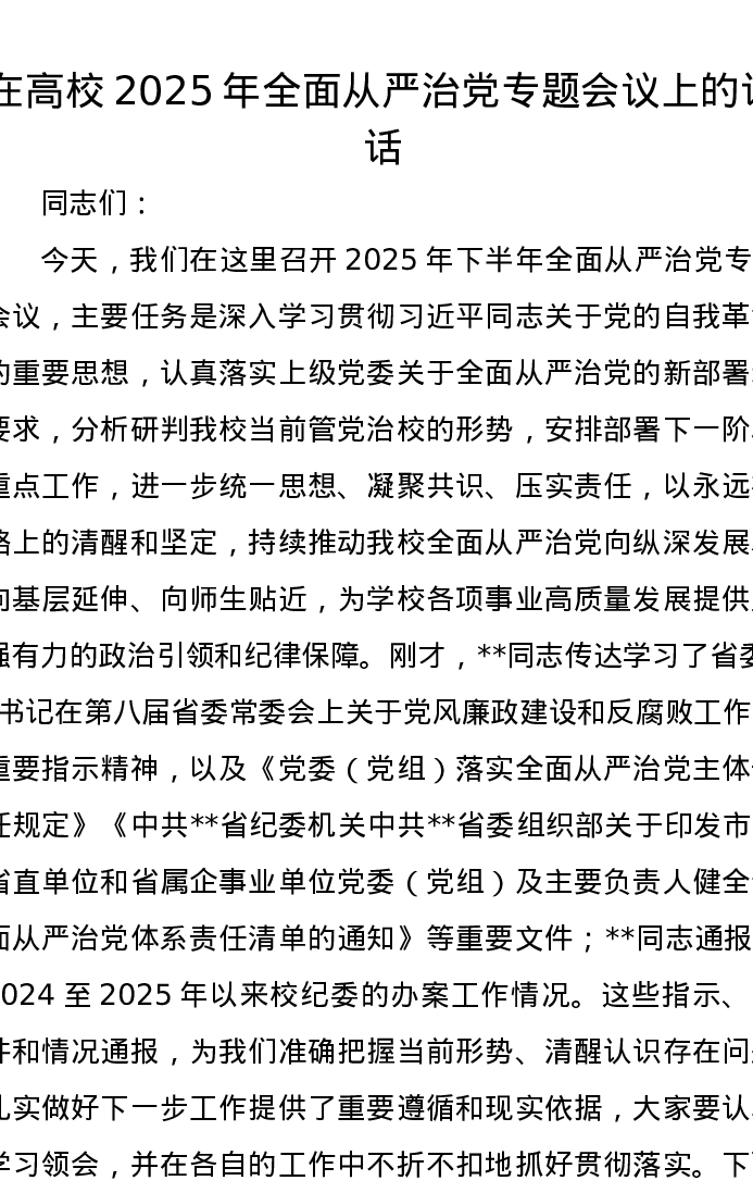 在高校2025年全面从严治党专题会议上的讲话
