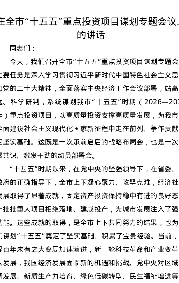 在全市“十五五”重点投资项目谋划专题会议上的讲话
