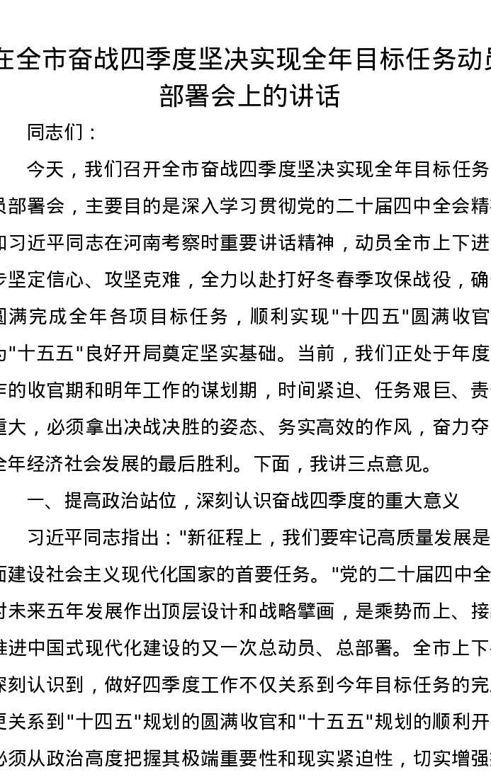 在全市奋战四季度坚决实现全年目标任务动员部署会上的讲话