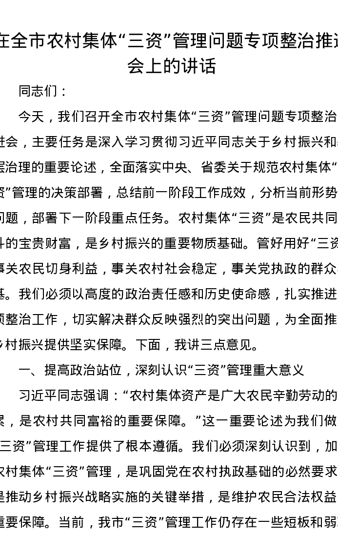 在全市农村集体“三资”管理问题专项整治推进会上的讲话