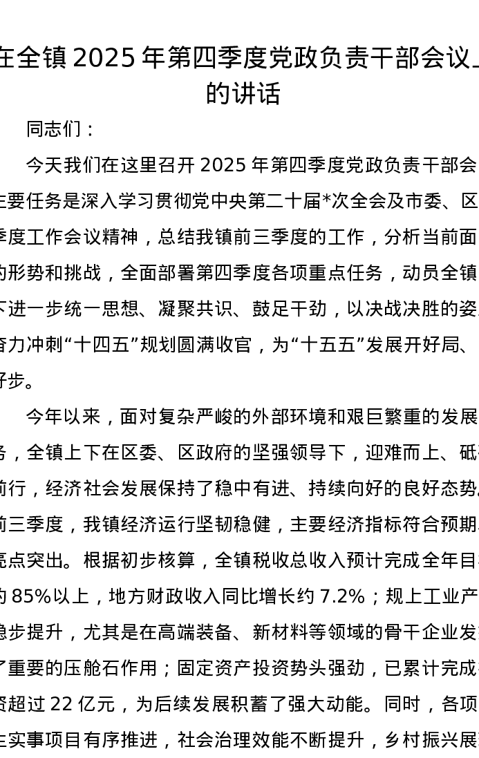 在全镇2025年第四季度党政负责干部会议上的讲话