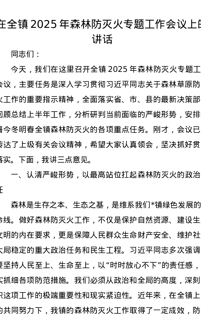在全镇2025年森林防灭火专题工作会议上的讲话