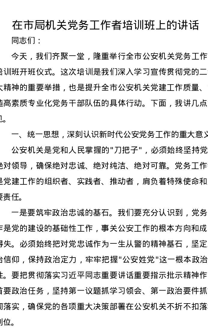 在市局机关党务工作者培训班上的讲话