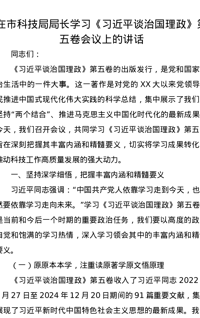 在市科技局局长学习《习近平谈治国理政》第五卷会议上的讲话