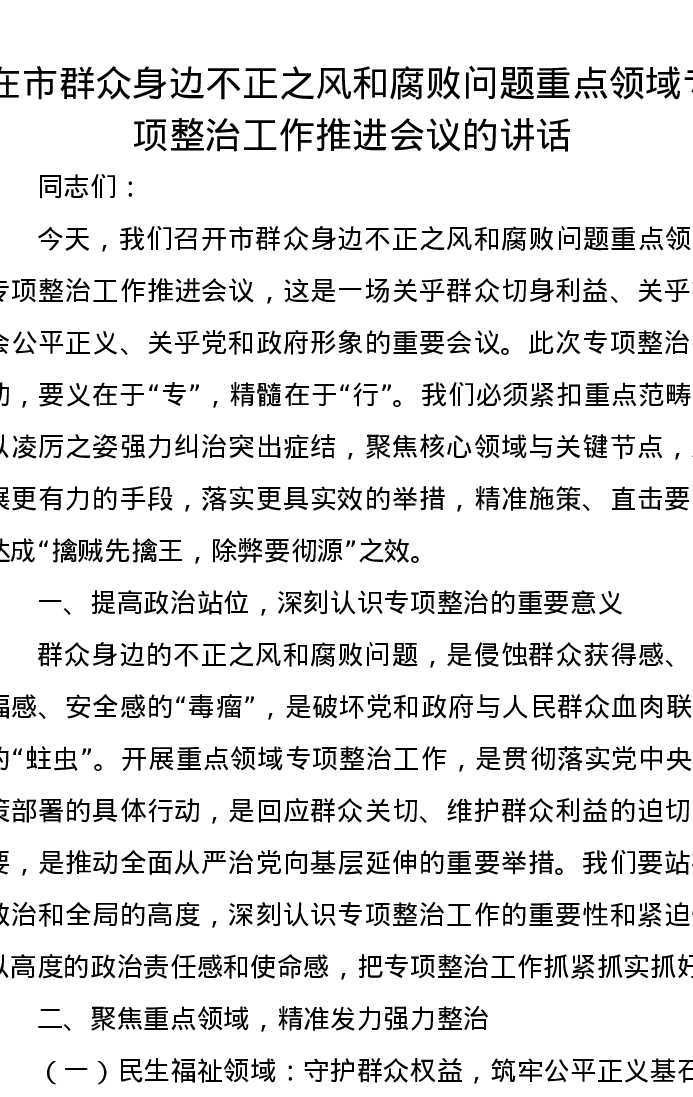 在市群众身边不正之风和腐败问题重点领域专项整治工作推进会议的讲话