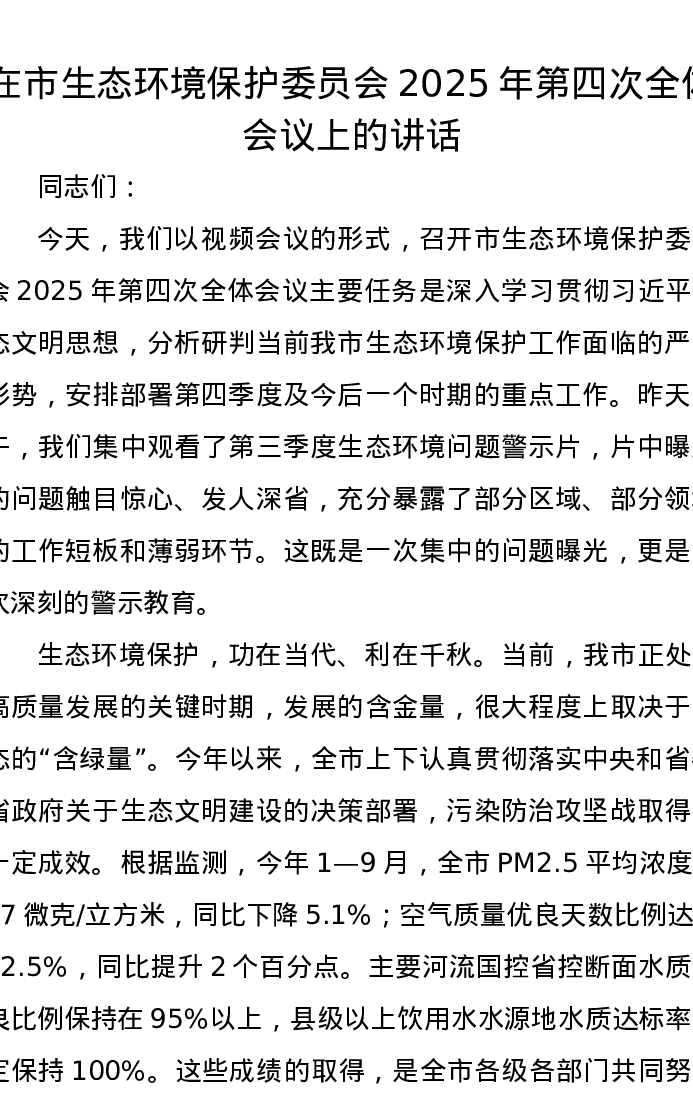 在市生态环境保护委员会2025年第四次全体会议上的讲话