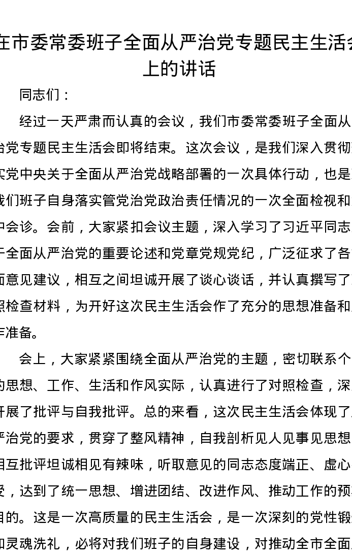 在市委常委班子全面从严治党专题xxxxx上的讲话