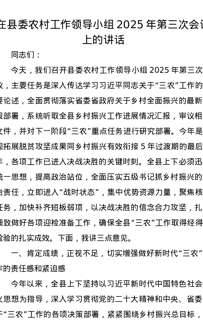 在县委农村工作领导小组2025年第三次会议上的讲话