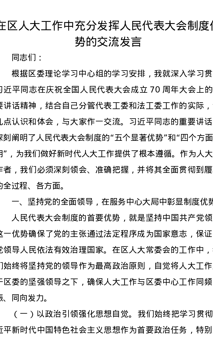 在区人大工作中充分发挥人民代表大会制度优势的交流发言