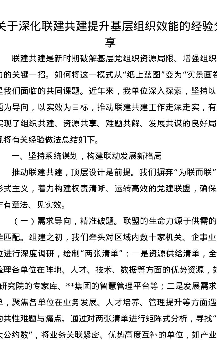 调研报告:关于深化联建共建提升基层组织效能的经验分享