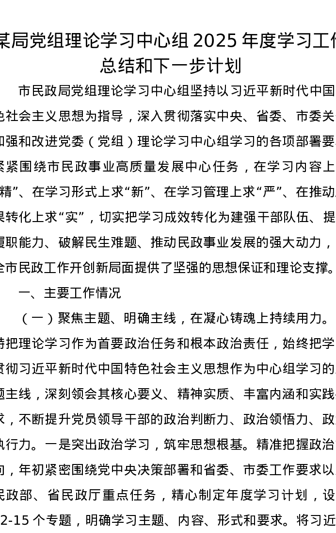 某局党组理论学习中心组2025年度学习工作总结和下一步计划