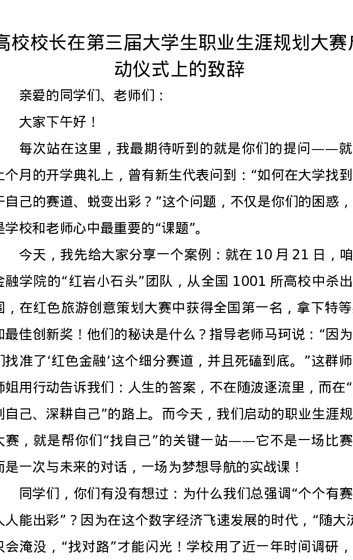 高校校长在第三届大学生职业生涯规划大赛启动仪式上的致辞