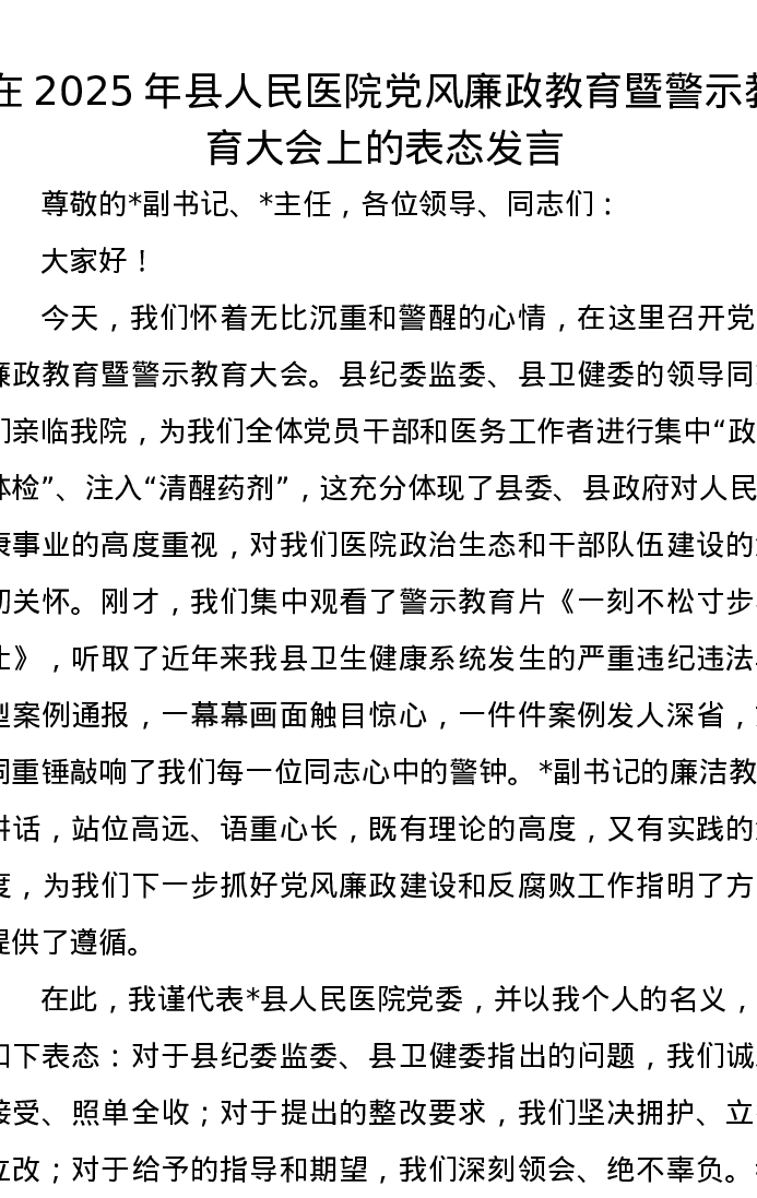 在2025年县人民医院党风廉政教育暨警示教育大会上的表态发言