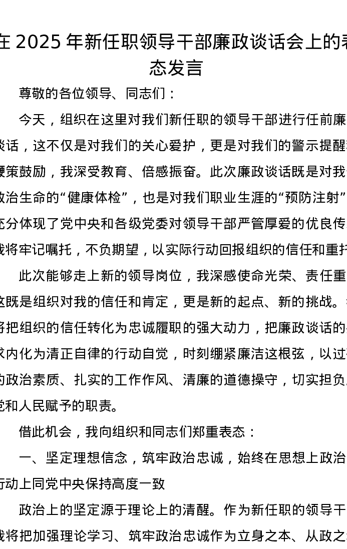 在2025年新任职领导干部廉政谈话会上的表态发言