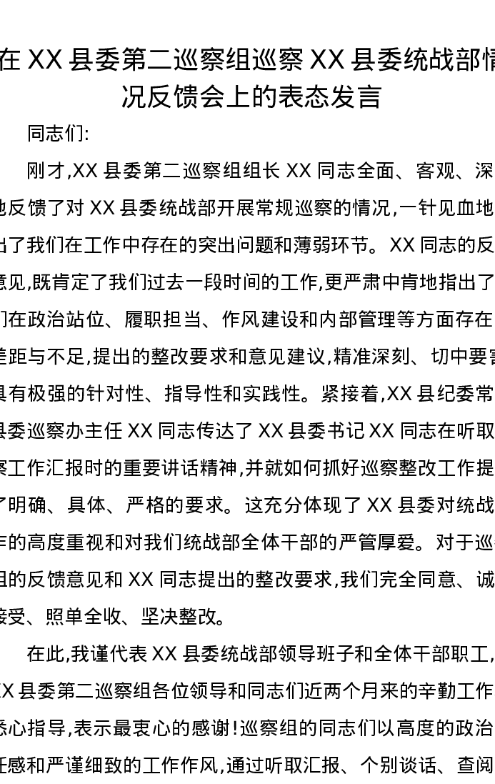 在XX县委第二巡察组巡察XX县委统战部情况反馈会上的表态发言